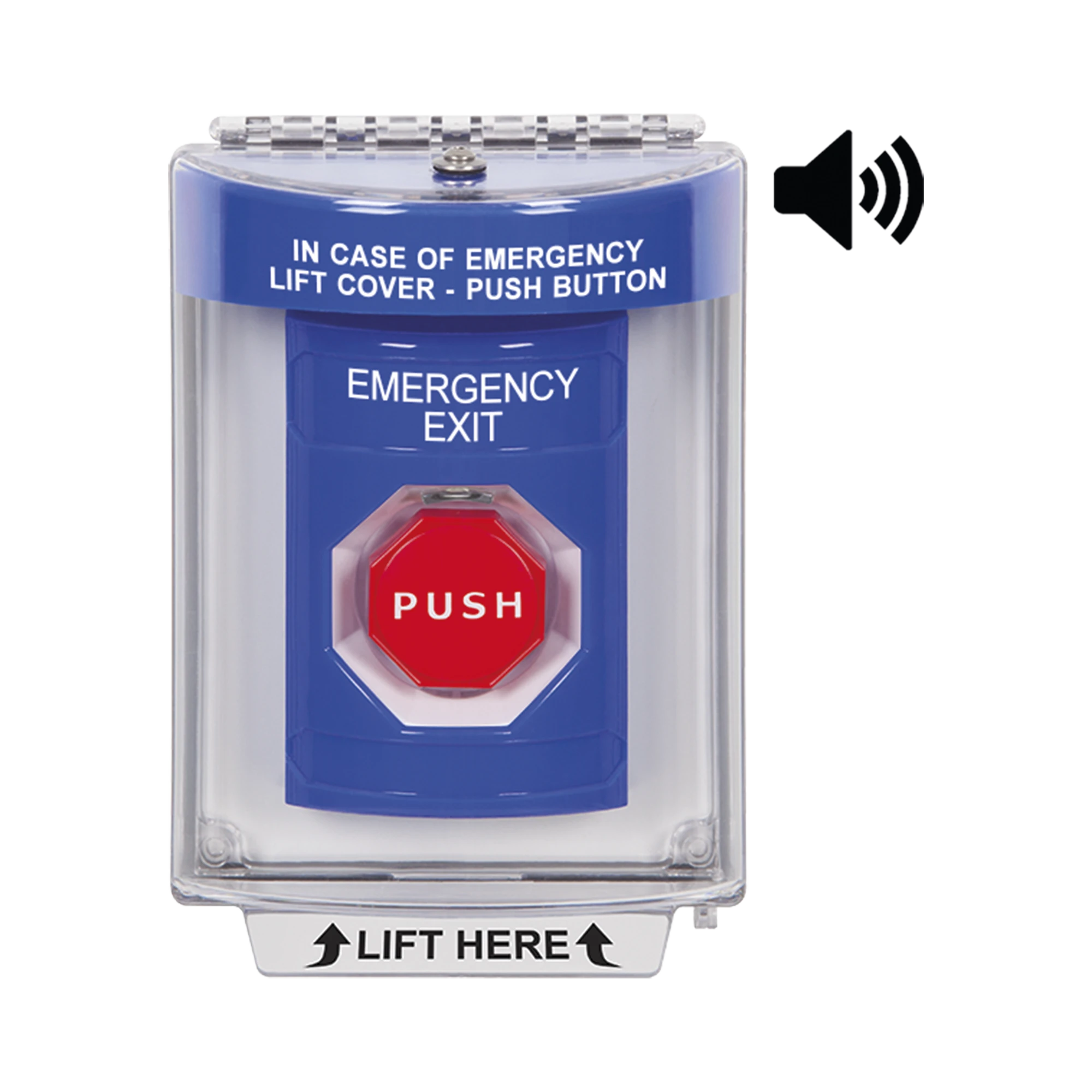 BOTÓN DE SALIDA, TEXTO EN INGLES, TAPA PROTECTORA DE POLICARBONATO SÚPER RESISTENTE, LLAVE PARA RESTABLECER, BOCINA INTEGRADA DE ADVERTENCIA
