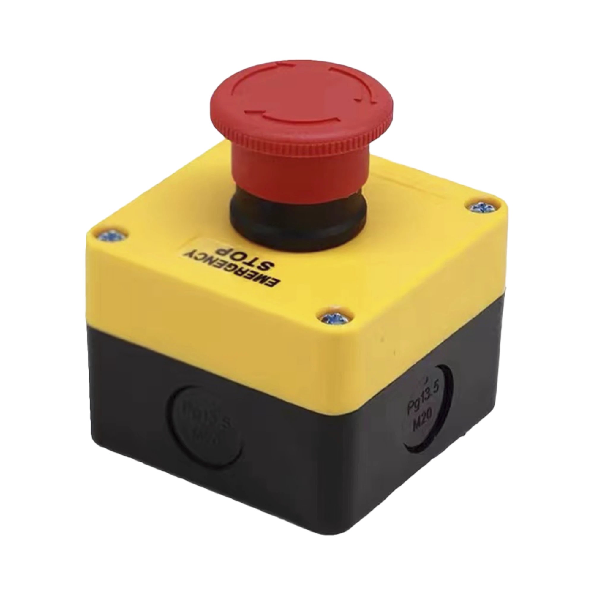 BOTÓN DE EMERGENCIA EN ESPAÑOL, COLOR AMARILLO, ACCIÓN MANTENIDA, GIRAR PARA RESTABLECER Y LED MULTICOLOR