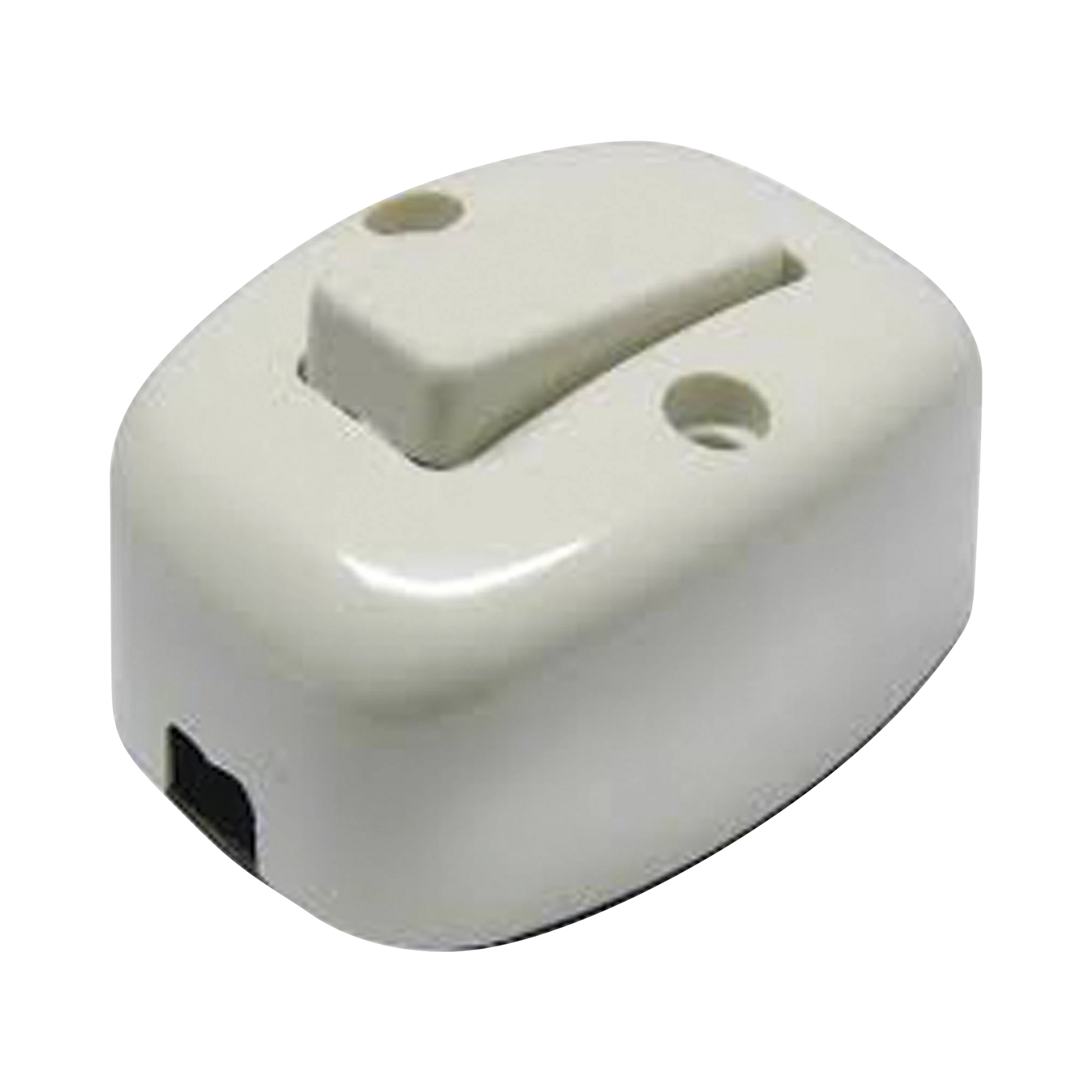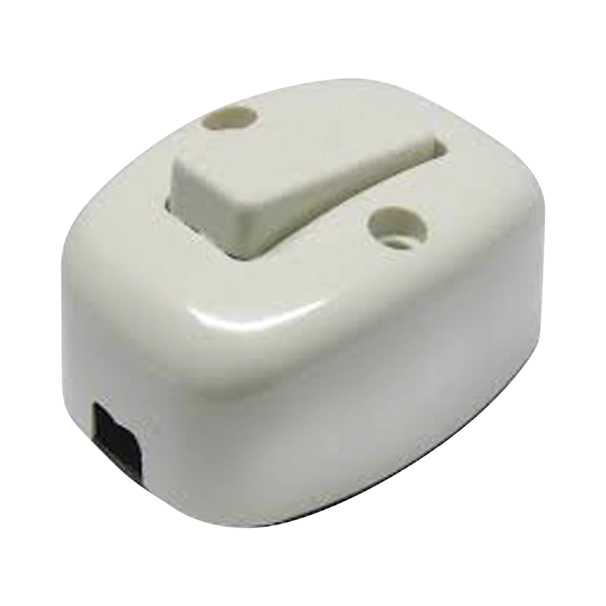 Nombre: APAGADOR SENCILLO VISIBLE DE BAQUELITA OVAL 6 AMP INCLUYE TORNILLOS Y BASES DE INSTALACIÓN.