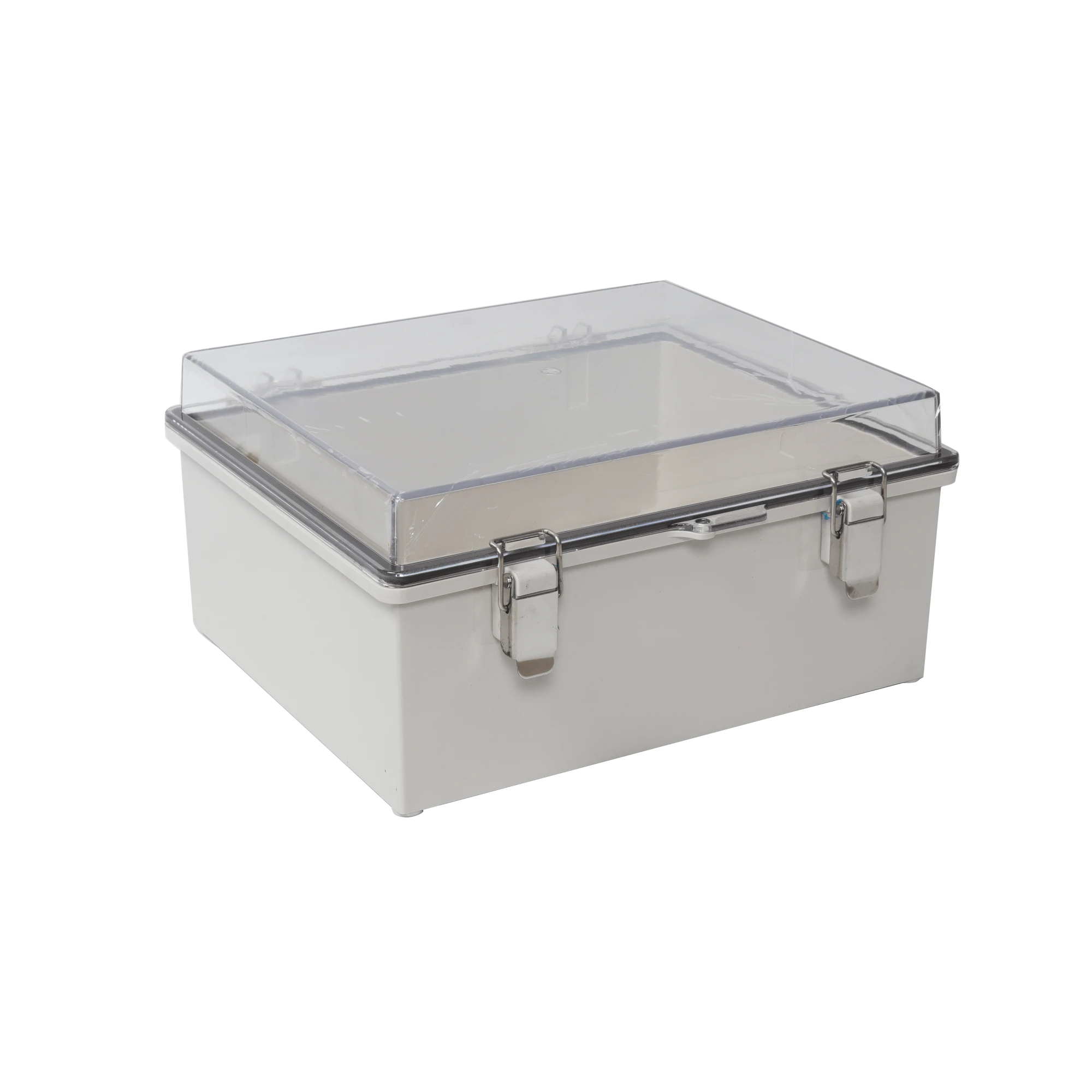 Nombre: GABINETE PLÁSTICO ABS, PUERTA TRANSPARENTE, USO EN INTEMPERIE IP66 (170 X 220 X 110 MM) CIERRE POR BROCHES INOXIDABLES.
