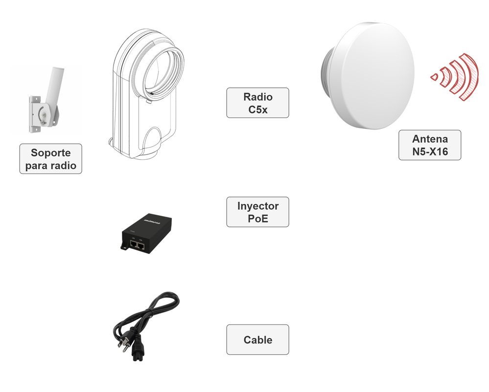 Kit radio C5x más antena N5-X12 con inyector PoE, cable de alimentación y soporte